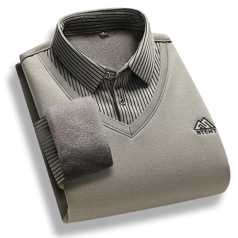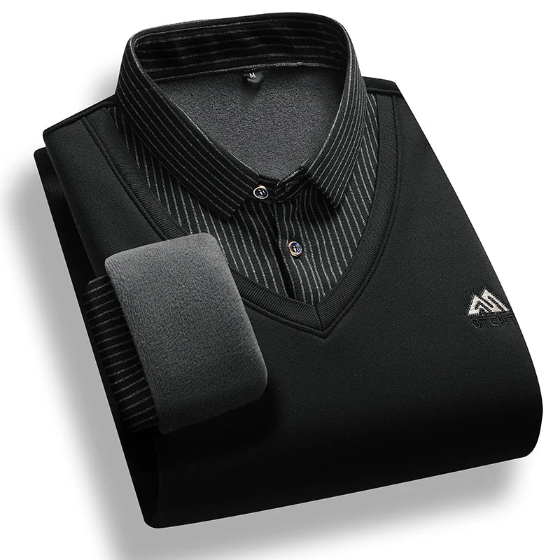 Elevate your winter wardrobe with this Men’s Luxury Fleece-Lined Sweater Shirt, a perfect blend of elegance, warmth, and comfort. Designed with a refined layered look, it features a V-neck sweater exterior combined with a striped button-up collar, delivering a sophisticated style without the bulk of multiple pieces.