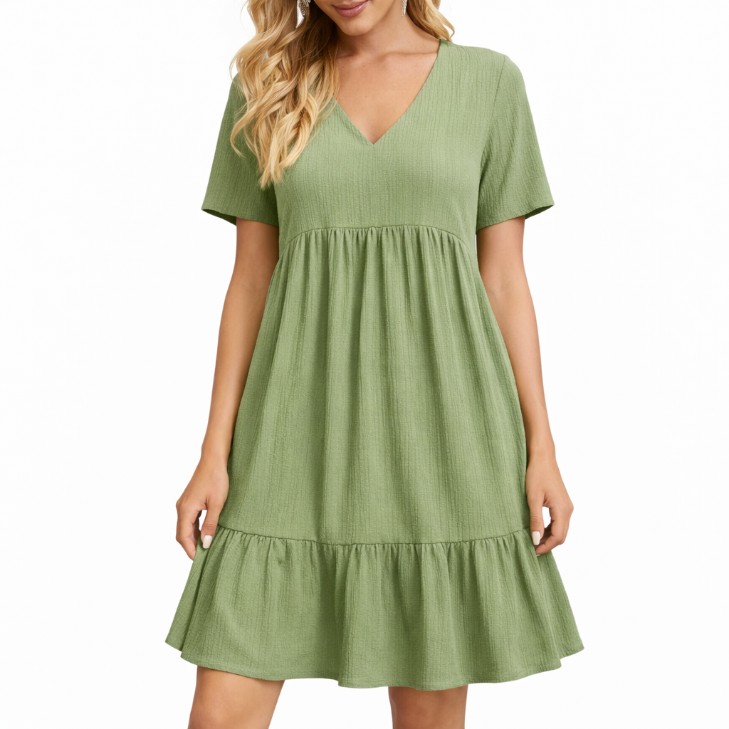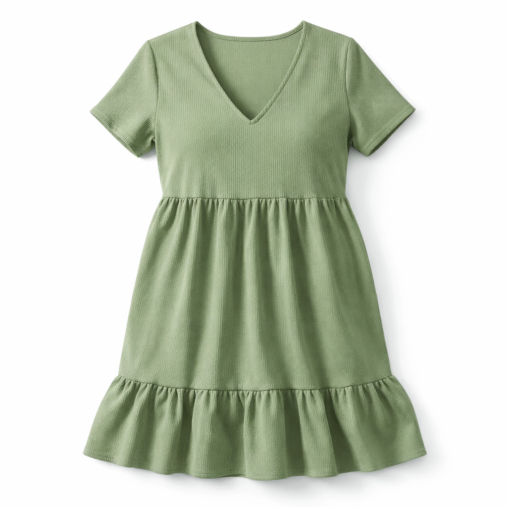 Um vestido pra resolver o look sem pensar muito: leve, confortável e com caimento soltinho, perfeito pra dias quentes, praia, passeio ou aquele casual arrumadinho do dia a dia. O decote V alonga o visual, a manga curta deixa mais fresco e o comprimento na altura do joelho traz equilíbrio: confortável e elegante na medida.